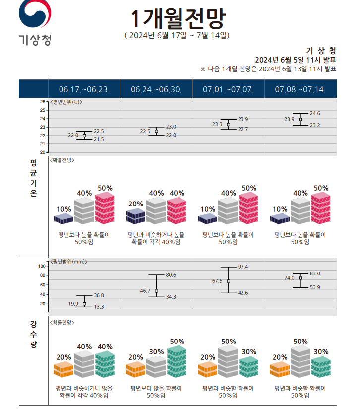 기상청은 6월 17~23일부터 장마 정체 전선이 형성되면서 2024년 장마가 시작될 것으로 예상했습니다. 올해 여름은 평년보다 덥고, 많은 비가 내릴 것으로 전망했는데 이는 열대 인도양 해수면 온도가 평년보다 높기 때문이라고 합니다.