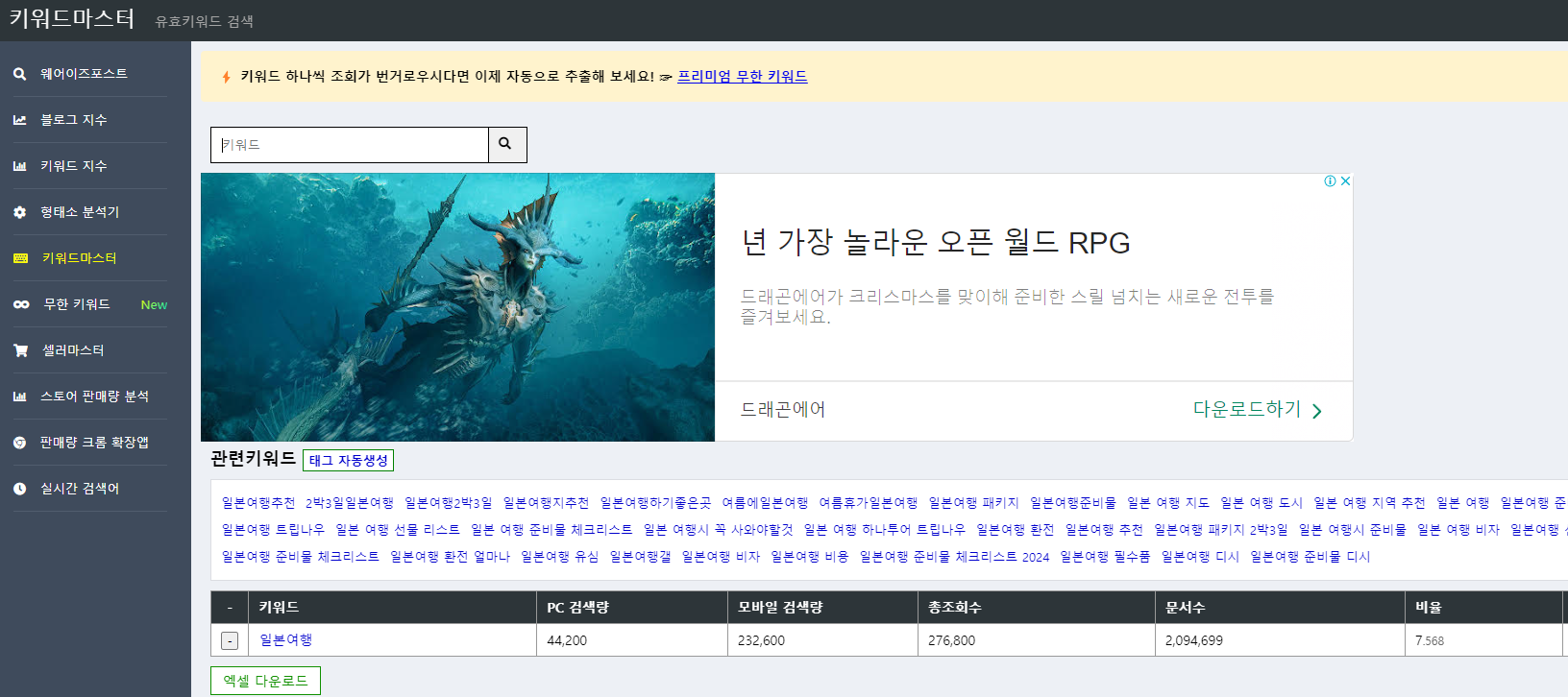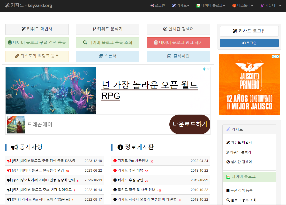 키워드 분석, 연관 키워드, 실시간 검색어 정보를 모두 제공해주는 사이트입니다. 사이트에 광고가 많아서 보기에는 좀 불편한데 세가지 정보를 모두 제공해주는 사이트여서 도움이 많이 되는 것 같습니다. 로그인을 하지 않아도 키자드에서 무료로 제공하는 정보를 볼 수 있기때문에 편하다는 것이 장점입니다!!