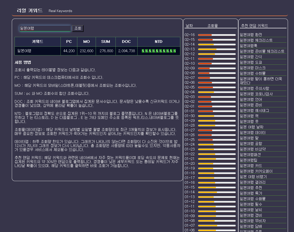 리얼키워드에서는 검색한 키워드와 관련해서 네이버에서 자주 찾는 키워드를 랜덤으로 제공해줍니다. 사이트가 광고없이 깔끔해서 보기편한데 이런 랜덤키워드 기능도 있으니 자주 이용하게 될 것 같습니다.