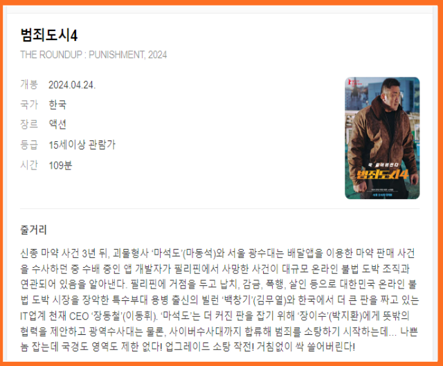 범죄도시4 개봉일은 2024년 4월 24일 수요일입니다. 평일이니까 미리 연차쓰고 첫날에 영화관에 다녀와야겠어요. ^^ 등급은 15세 관람가입니다. 윤계상이 빌런으로 등장했던 범죄도시 1은 청소년관람불가였는데, 그 이후부터는 보다 더 많은 사람들이 관람할 수 있도록 15세 관람가로 조정한 것 같습니다. 러닝타임은 1시간 50분이며, 제작사는 빅펀치엔터테인먼트라고 합니다.