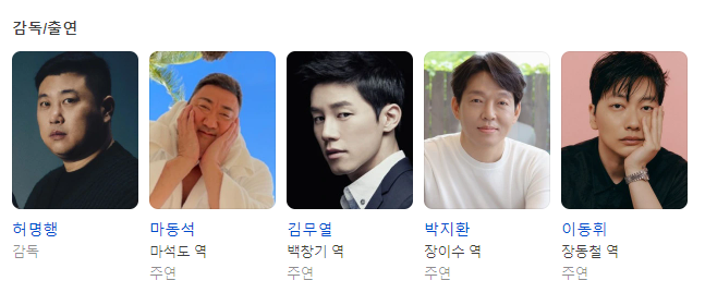 - 주연 : 마동석(마석도 역), 김무열(빌런 백창기 역), 박지환(장이수 역), 이동휘(장동철 역)