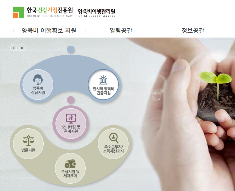 - 신청방법 : 한국건강가정진흥원 회원가입 후 로그인하여 온라인 신청하시거나 양육비이행관리원 접수처를 통해 오프라인 접수도 가능합니다. (문의 양육비이행관리원 1644-6621)