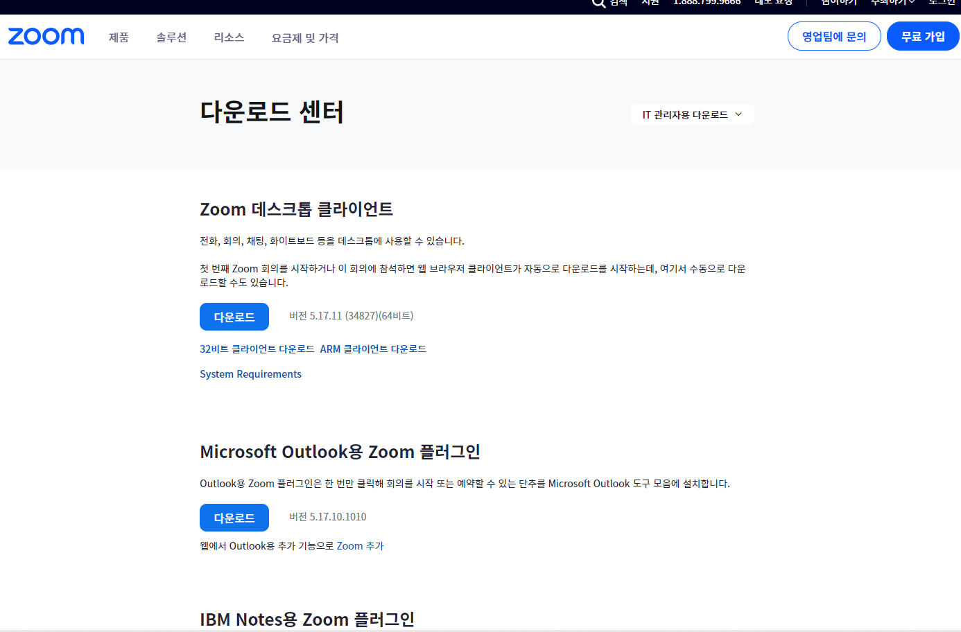 바로가기로 줌 공식 사이트로 이동하시면 아래 화면에서 보시는바와 같이 바로 다운로드 화면이 나오는게 아니라 줌AI 요금제 및 가격소개 등 홍보페이지가 나옵니다.