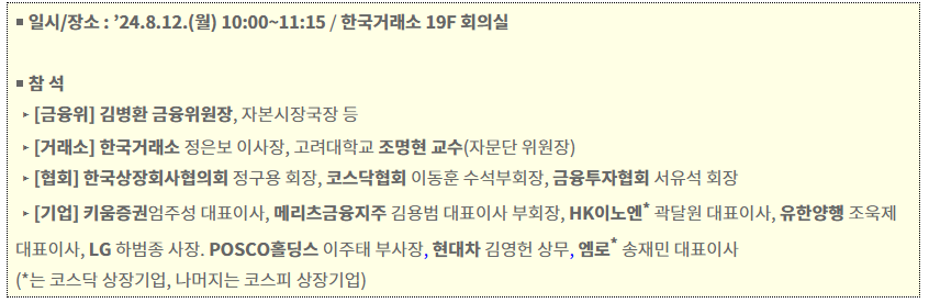 - 특히 정부에서 8월 12일에 개최한 기업 밸류업 상장기업 간담회에는 키움증권, 메리츠금융지주, HK이노엔뿐만 아니라 유한양행, LG, POSCO홀딩스, 현대차, 엠로도 참여했다고 합니다.