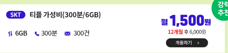 SKT 망 | 데이터 6GB 통화 300분 문자 300건 | 월 1,500원 (12개월 후 6,000원) 유심비 별도 (8800원) |