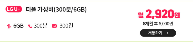 LG유플러스 망 | 데이터 6GB 통화 300문 문자 300건 | 월 2,920원(6개월 후 6,000원) 유심 원칩 지금 무료배송 이용시 스타벅스 아메리카노 기프티콘 지급(~4.30) |