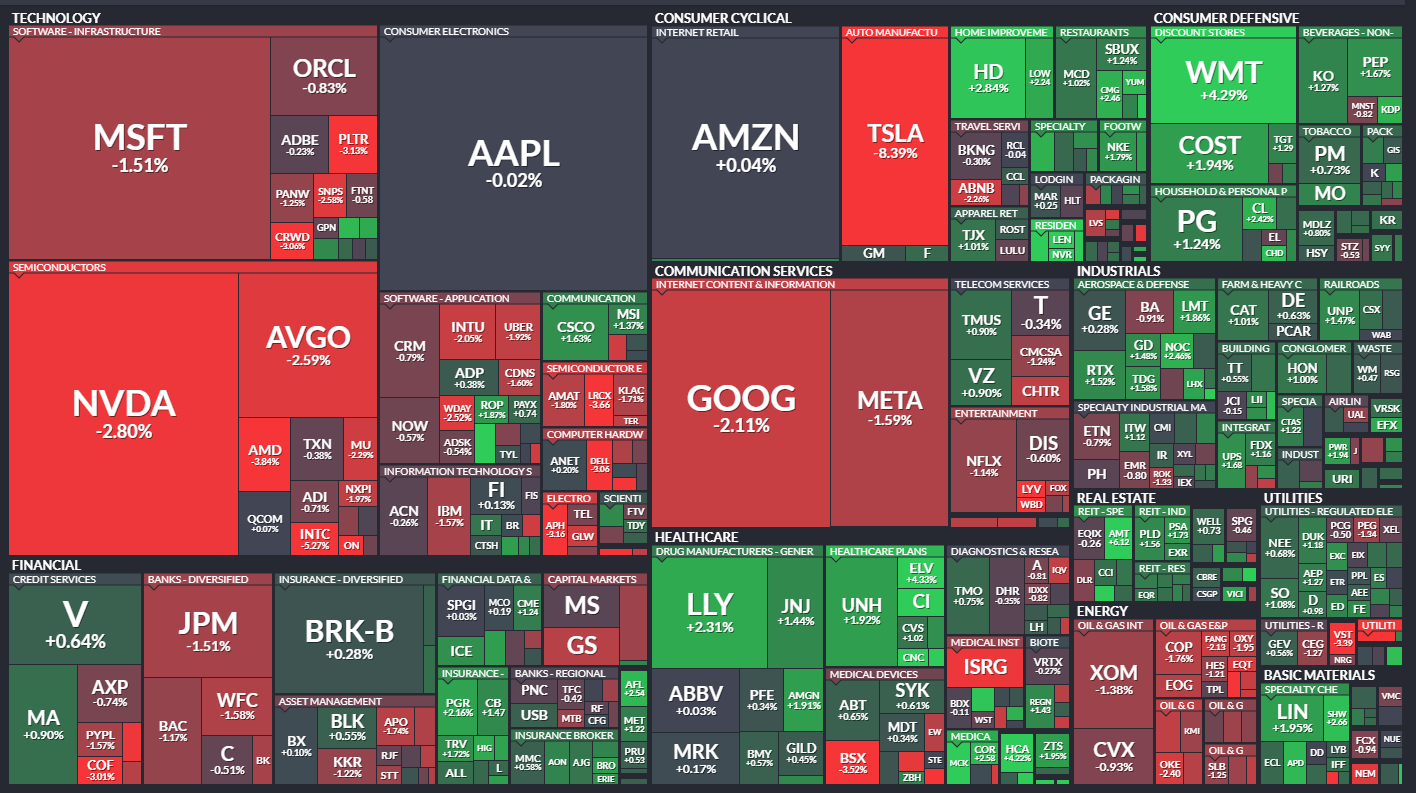 대형 기술주 중심으로 큰 폭의 하락. 다우존스는 오히려 상승.