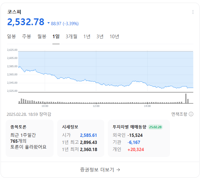 기업의 펀더멘털보다는 트럼프 관세 발언과 스태그플레이션 우려로 인한 투자심리 위축이 이번 하락의 주된 원인이 아닐까 싶은데.. 투자자 입장에서는 그래도 미국 이외에 다른 투자처가 마땅치 않은게 함정. 오늘은 잘 버티던 국장도 크게 하락