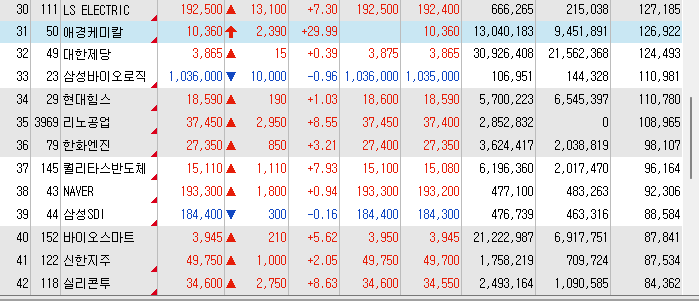동양철관, 대한제당, 삼성중공업, 영흥, 삼성전자, 한화솔루션