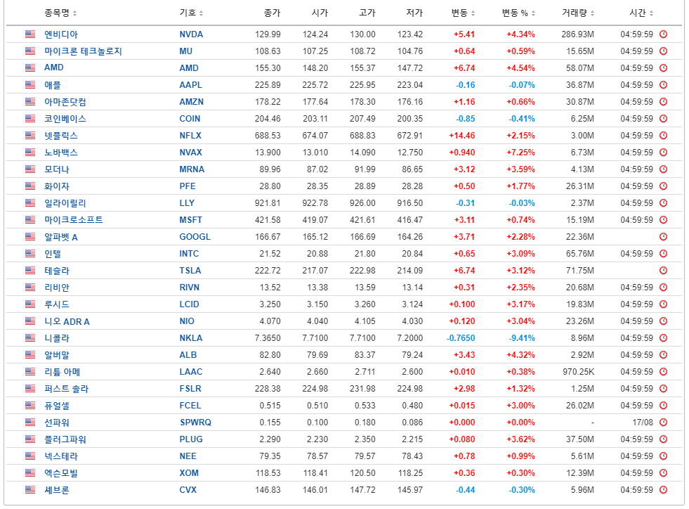 미국 주요 주식들이 많이 상승했는데, 특히 엔비디아가 다음 주 실적발표를 앞두고 빠르게 회복 중이며, 테슬라도 3.12%나 상승했습니다.