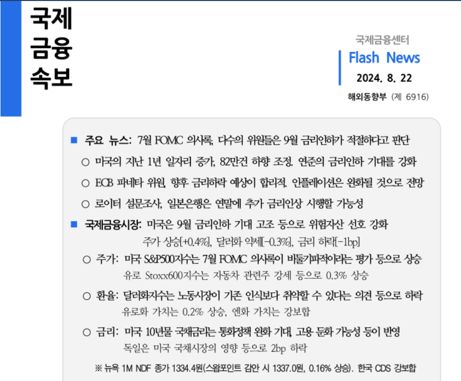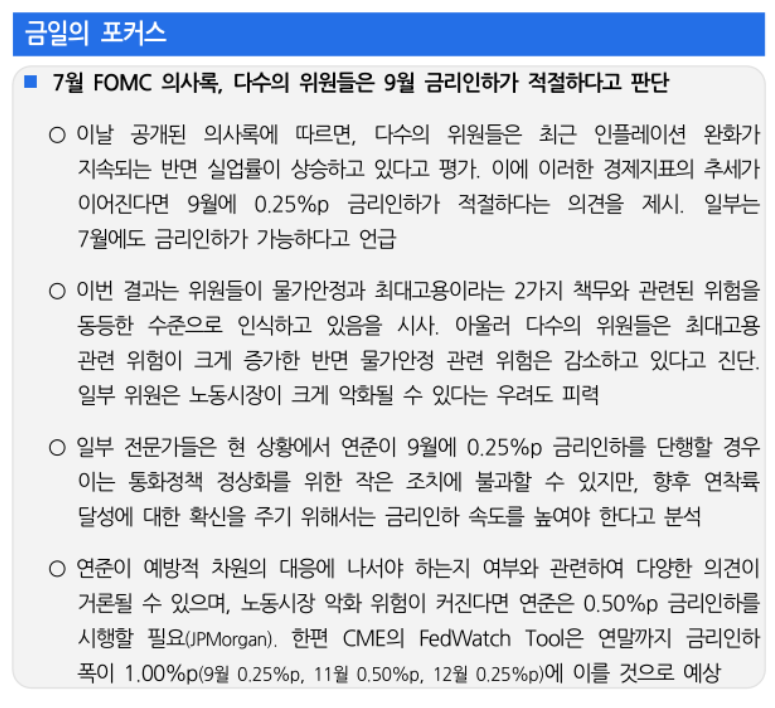 공개된 FOMC 의사록에 따르면 다수 위원들이 9월 금리인하가 적절하다는 의견을 제시했다고 합니다. 이로써 9월 금리인하는 기정사실이 되었으며 이제 어느 정도 속도로 진행될지가 관건이 되겠네요.
