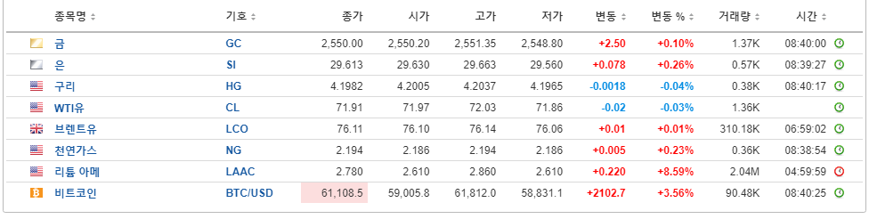원자재 및 비트코인 시세