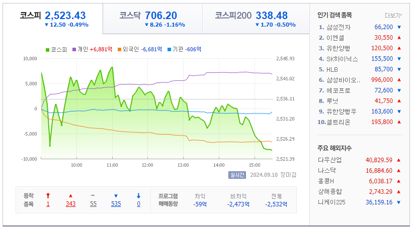 시장은 관망세를 보이고 있다. 하락 추세를 반전시킬만한 모멘텀 부재. 추가 하락 모멘텀도 딱히 보이지 않는 듯. 다음 주 연준의 금리 결정을 앞두고 몸을 사리는 듯한 느낌. 만약 이대로 시장의 공포가 사라지지 않는다면 빅컷이든 아니든 시장은 추가 하락으로 이어질 수도 있을 것 같습니다.