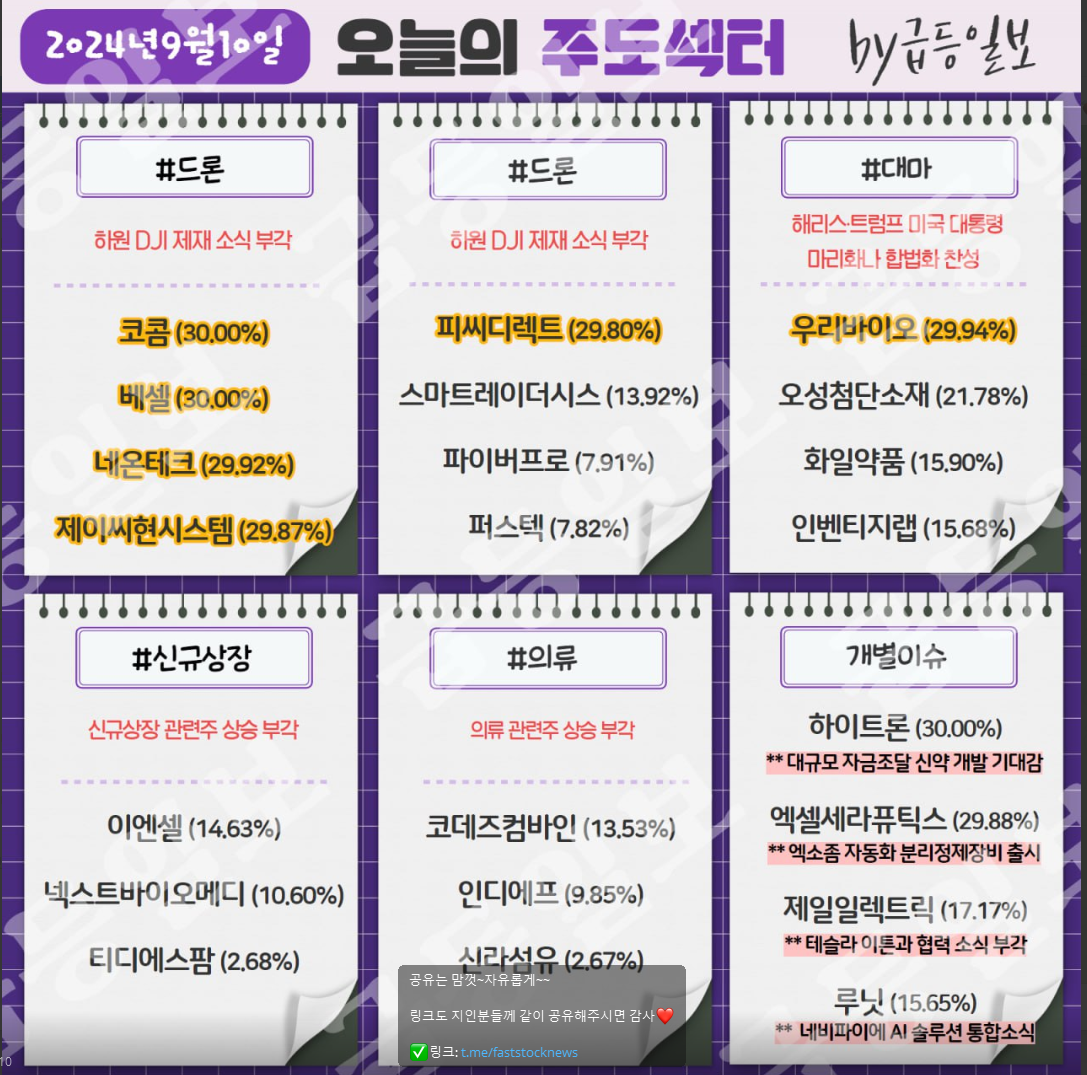 오늘의 주요 테마, 상한가 종목, 거대대금 상위 상승률 높은 종목