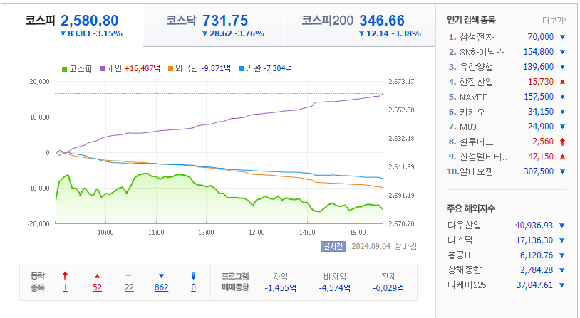 오늘 코스피는 어제 미국 시장의 폭락 여파로 무려 83.83포인트나 하락했습니다. 장 초반부터 하락해서 반등 한번 없이 장 마감까지 쭉 하락하는 모습이라 내일 시장도 걱정입니다. 외국인과 기관모두 순매도로 대응했고, 개인이 약 1조 6천억 원가량을 순매수했습니다. 거래대금 11.2조