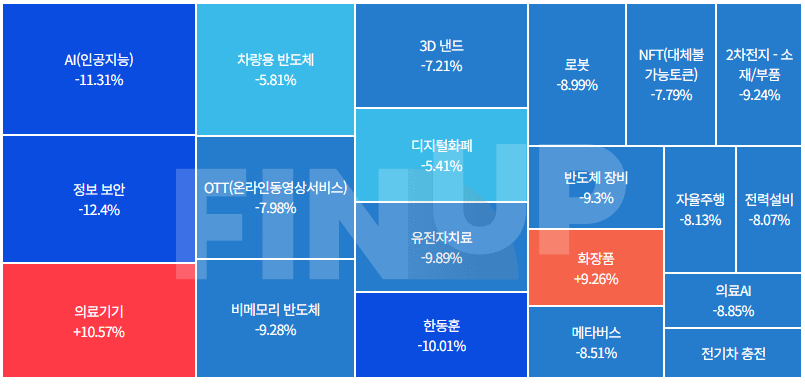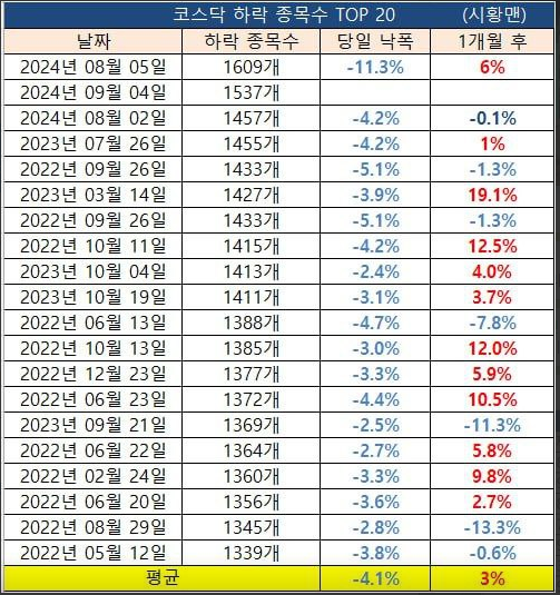 시황맨 자료에 따르면 오늘 코스닥 하락 종목수는 역대 두 번째로 많은 날이었습니다. 그만큼 시장이 어렵고, 특히 스캘핑이 아니라 스윙 투자를 하는 분들에게는 손실이 큰 날이었을 것 같습니다. 하지만 당장 미국 선물지수가 반등하지 않고 있어서 평단가를 낮추기 위한 추가 매수보다는 시장을 좀 더 지켜보면서 매매해야 할 것 같습니다.