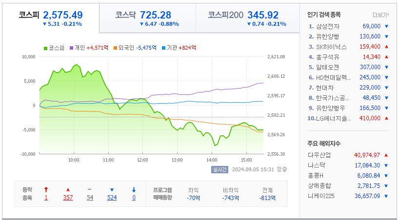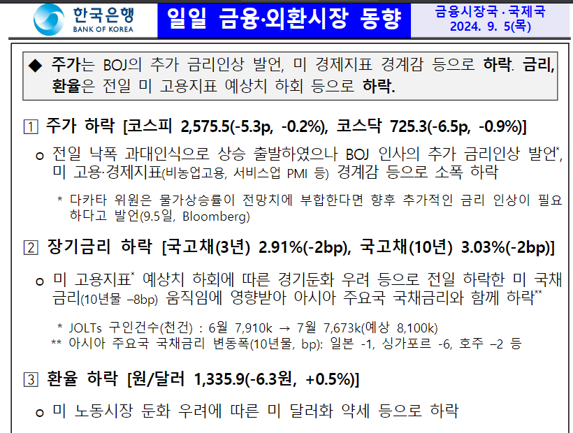 어제 낙폭이 워낙 컸던 터라 장 초반 저가 매수세 유입으로 상승을 보여주던 우리 증시는 점심시간부터 꺾이더니 결국 하락 마감했습니다. 미국 선물지수와 닛케이도 비슷하게 하락했는데, 엔화 강세 우려가 시장 전체적으로 블랙먼데이 공포를 상기시키며, 오늘 발표될 미국 서비스업 지수 등 발표를 앞두고 경계감을 높인 것 같습니다.