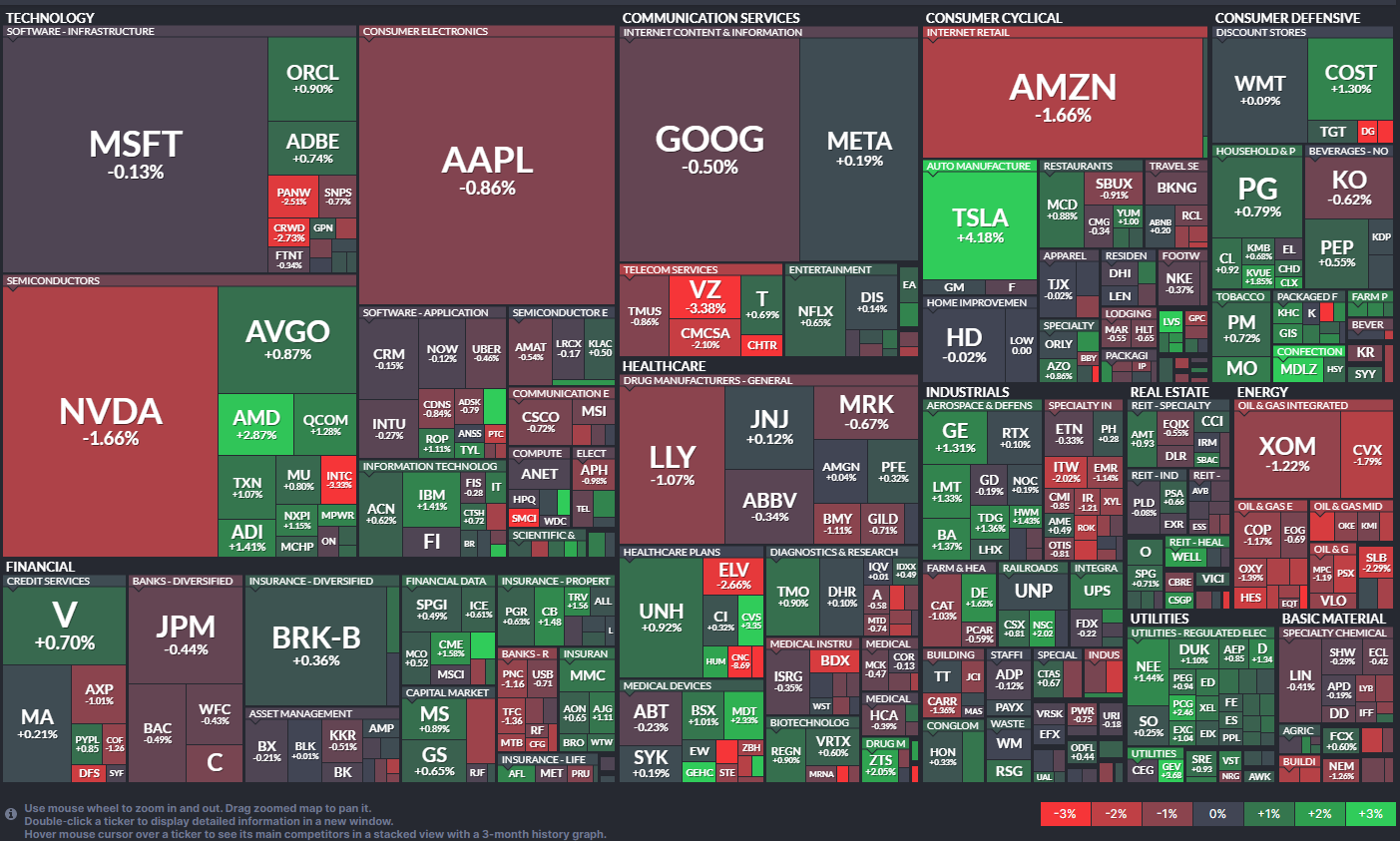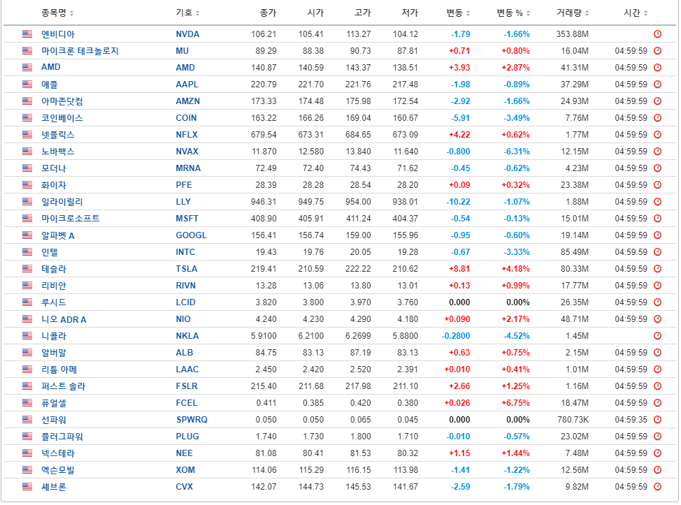 엔비디아, 애플, 아마존 등 주요 대형 기술주들이 하락 마감했습니다. 반면 테슬라는 강하게 반등.
