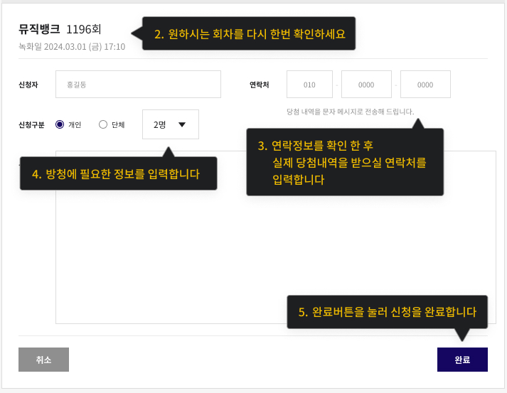 4. 당첨여부 확인 후 당첨 시 좌석 선택 (당첨자 발표는 녹화일 1주일 전 목요일 오후 4시)