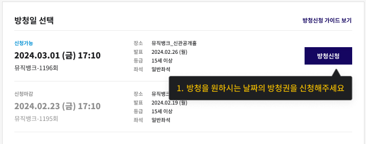 - 방청시간: 매주 수요일 오후 7시부터 오후 9시 30분(예정), 입장권 배부를 위해 오후 5시 30까지 도착필수