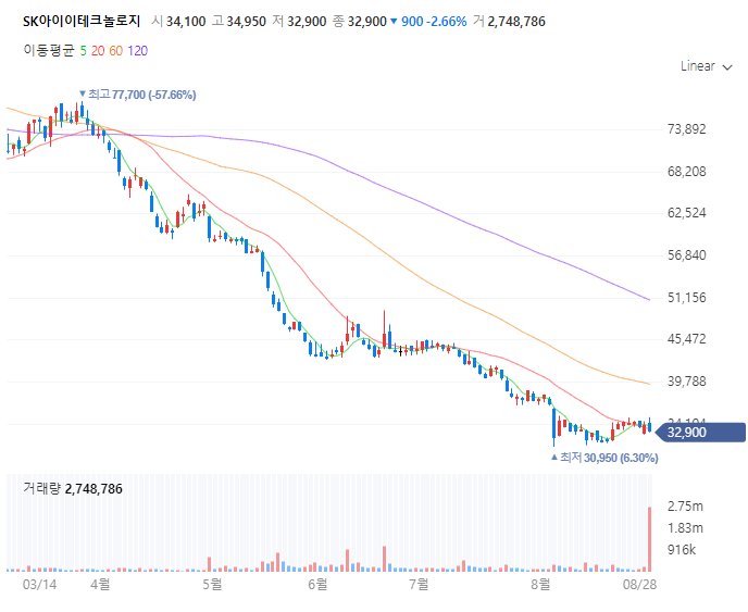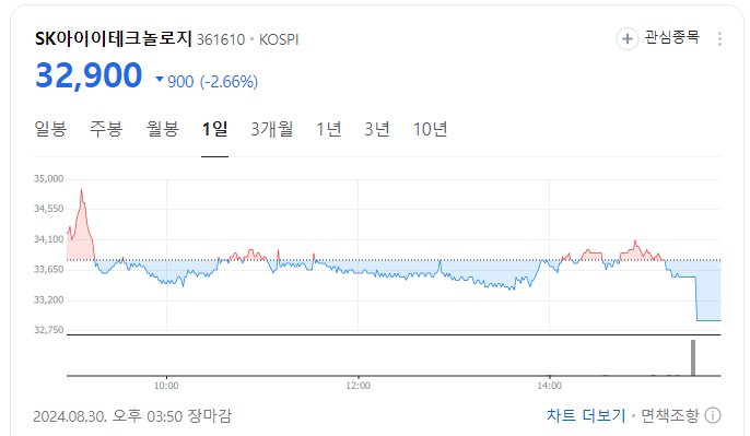 2024년 8월 30일 MSCI 한국지수 편출종목 SK아이테크놀로지 주가 흐름